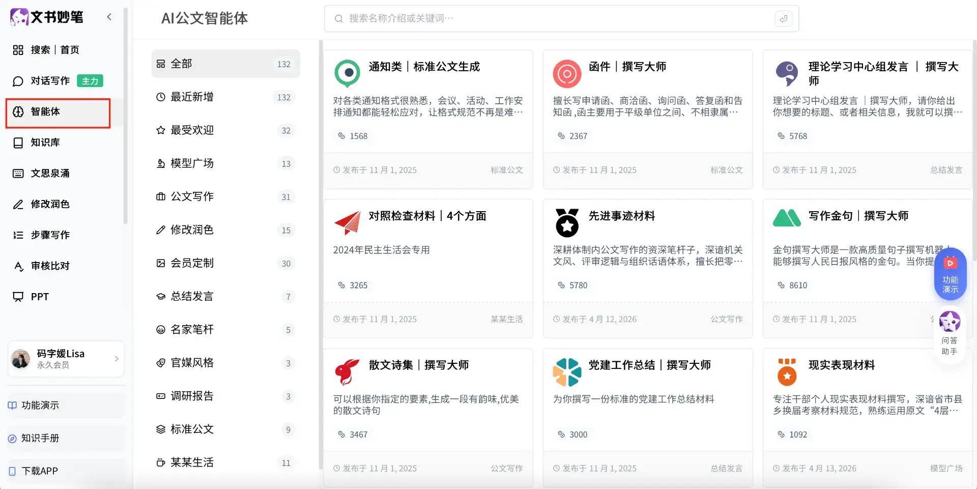 3,智能体:100多个已经做好的不同文风智能体,审核纠错、去AI味道、会议纪要、金句提纲、工作总结变领导讲话等等全部可以直接使用。