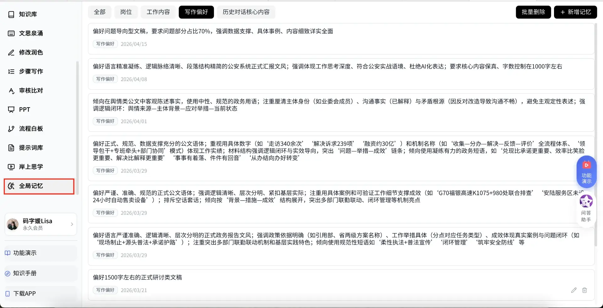 8,全局记忆:支持全局记忆,越写越聪明,还可以改写删除记忆。