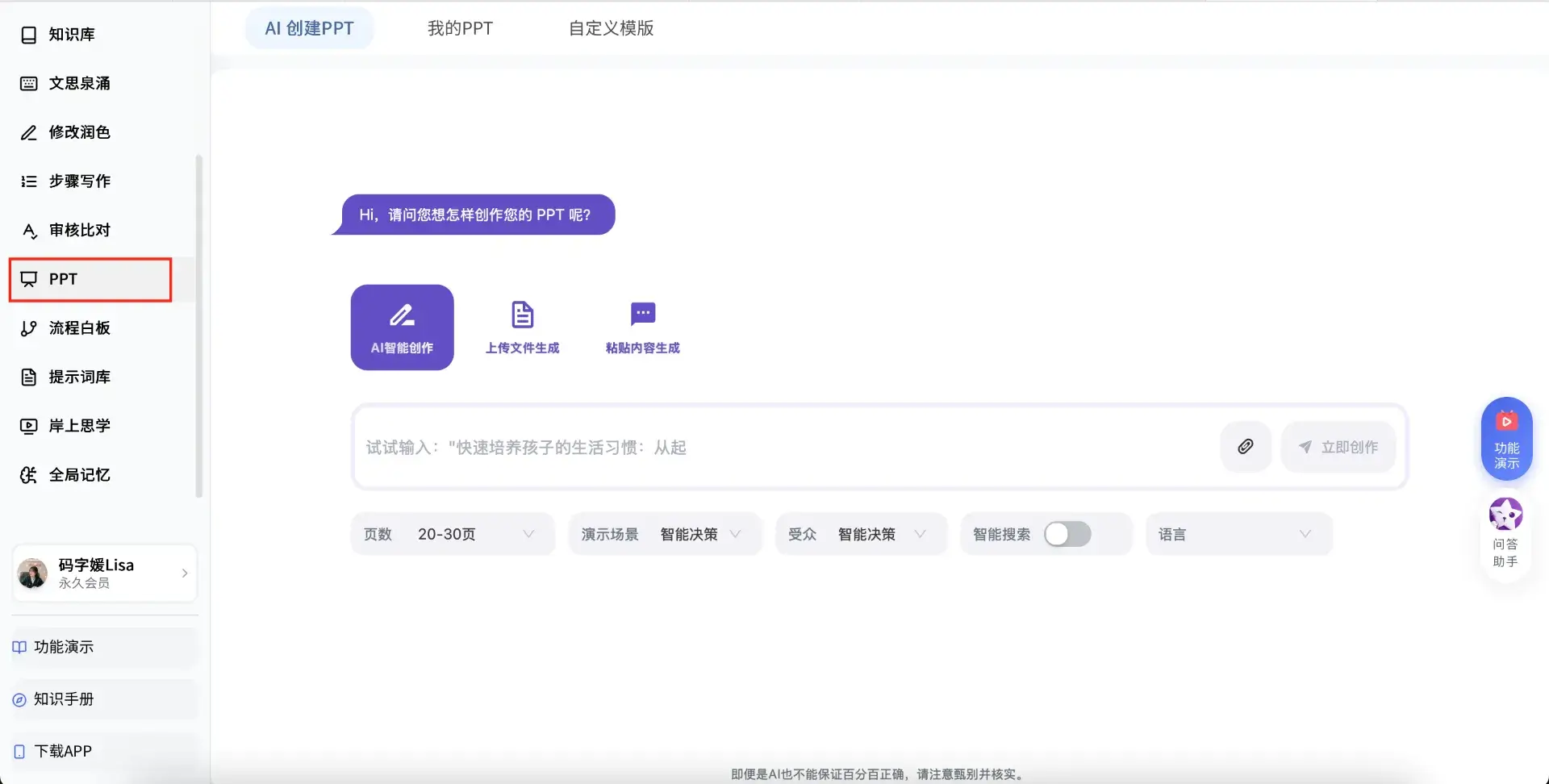 支持AI做PPT、录音转文字、文字转信息图、原创度检测等辅助功能