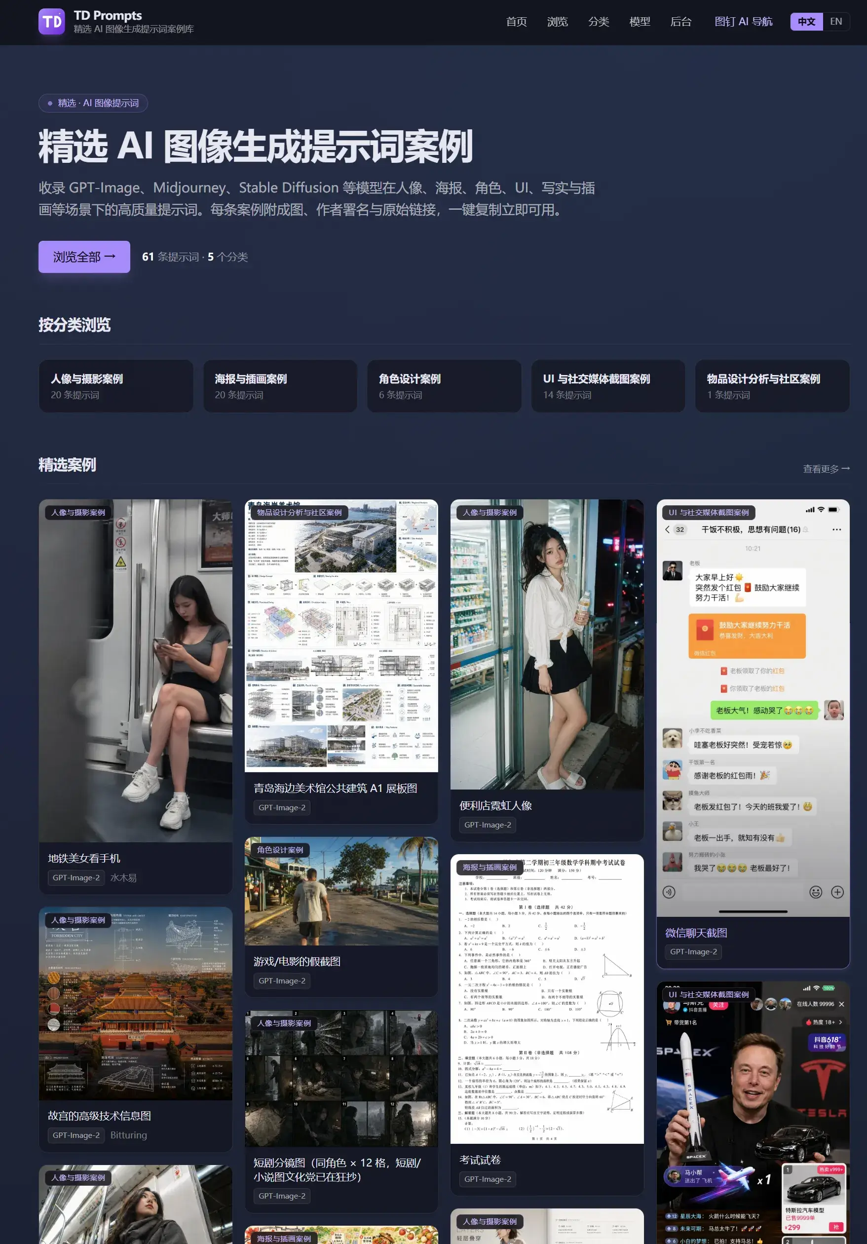 目前该网站主要收录的提示词案例为GPT-Image-2 大模型的提示词案例。截止到发文已经收录了GPT-Image-2 模型的 60条爆款提示词案例。